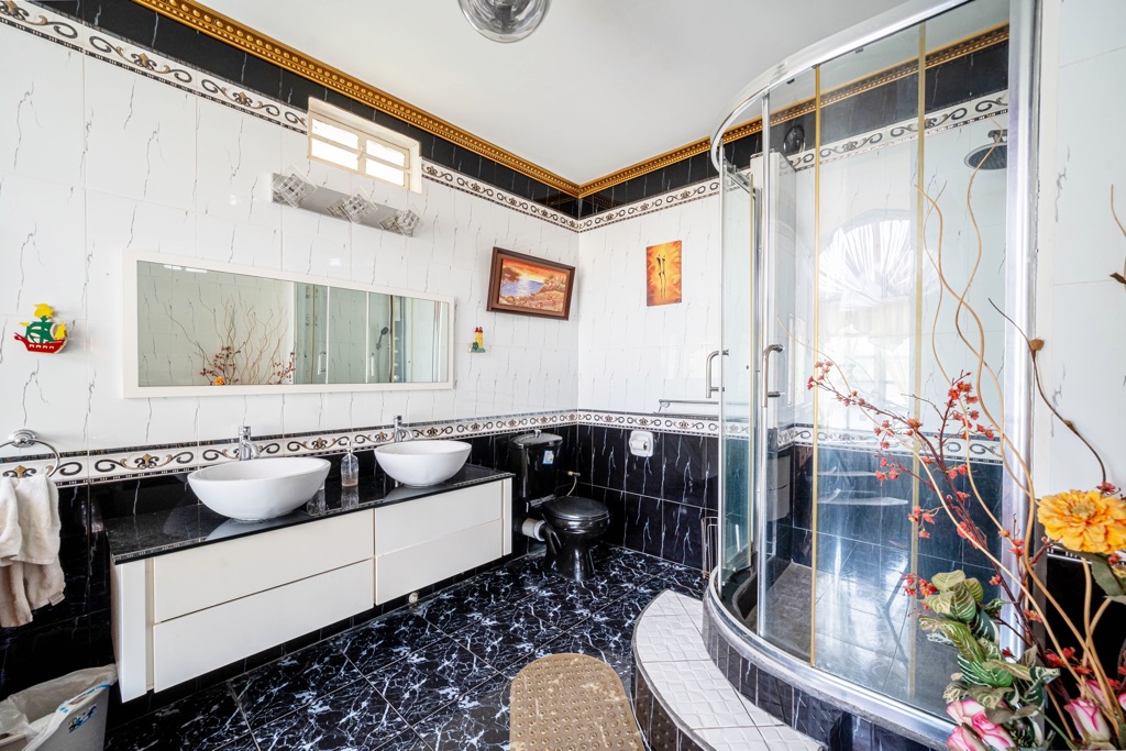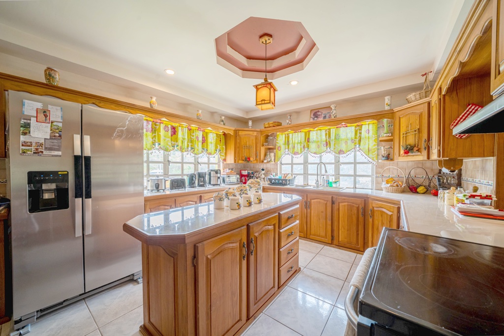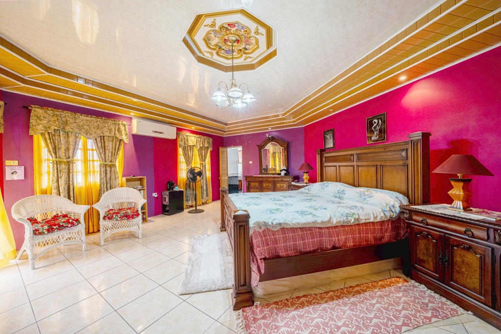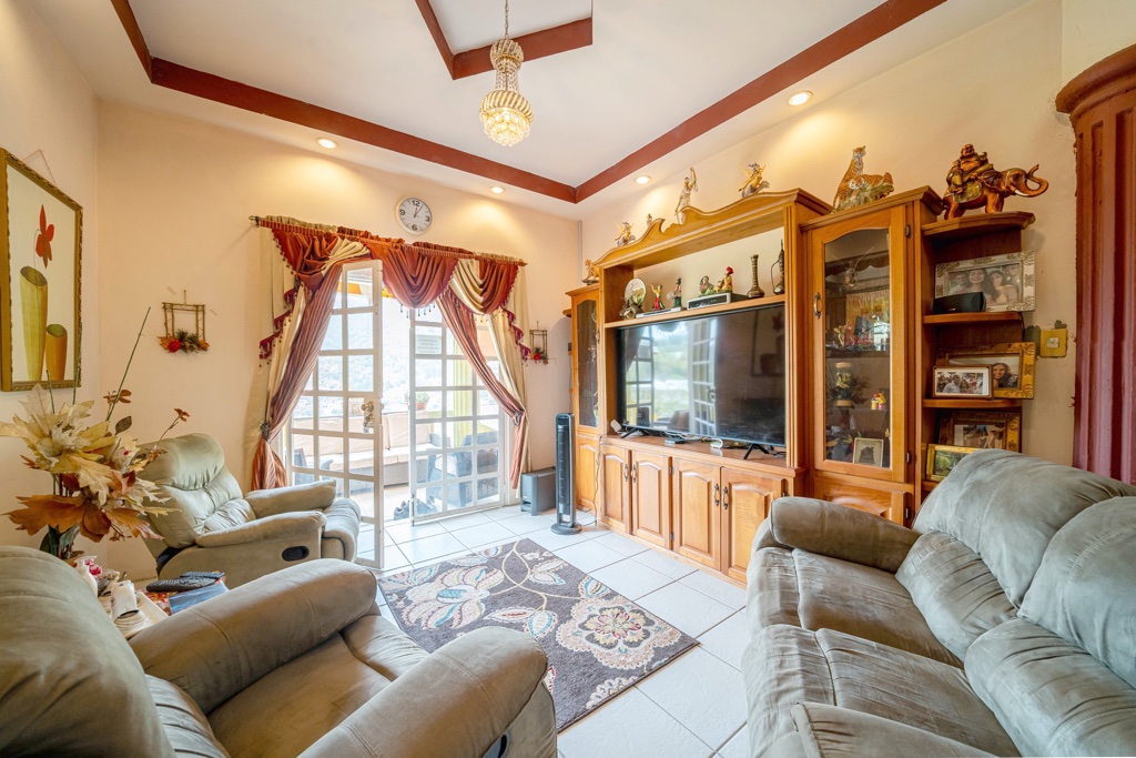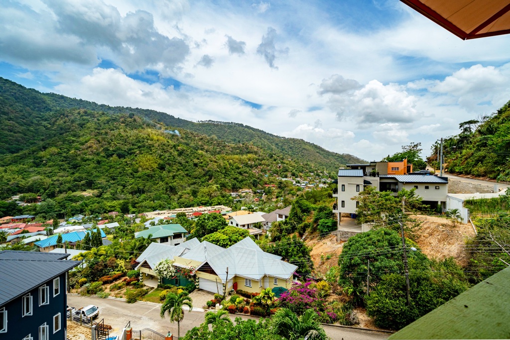 Perched on a hill, spanning over 10,000sf of land in the lush Maracas Valley, sits this grand three storey house, which offers all the comfort of home. One of the main features of this lovely home is the wrap around balcony on two floors, affording stunning panoramic views of the mountains. On the upper floors are 4 bedrooms with the primary en-suite, 4 bathrooms, an open plan TV, dining and living room with a sunken formal sitting area that opens out to the wrap around balcony. The spacious kitchen has customised teak cabinetry throughout with a generous breakfast nook. There is a covered area at the side the house, convenient for outdoor cooking and entertaining with ample storage and a separate laundry area. On the ground floor are two self contained apartments: a studio and a 2 bedroom with 1 bath unit, which can be rented separately. This home is surrounded by a beautifully landscaped garden, that attracts a variety of birds and is perfect for nature lovers! There is covered parking for 3 vehicles with additional roadside parking. This property is being rented fully furnished and equipped. – RR54884