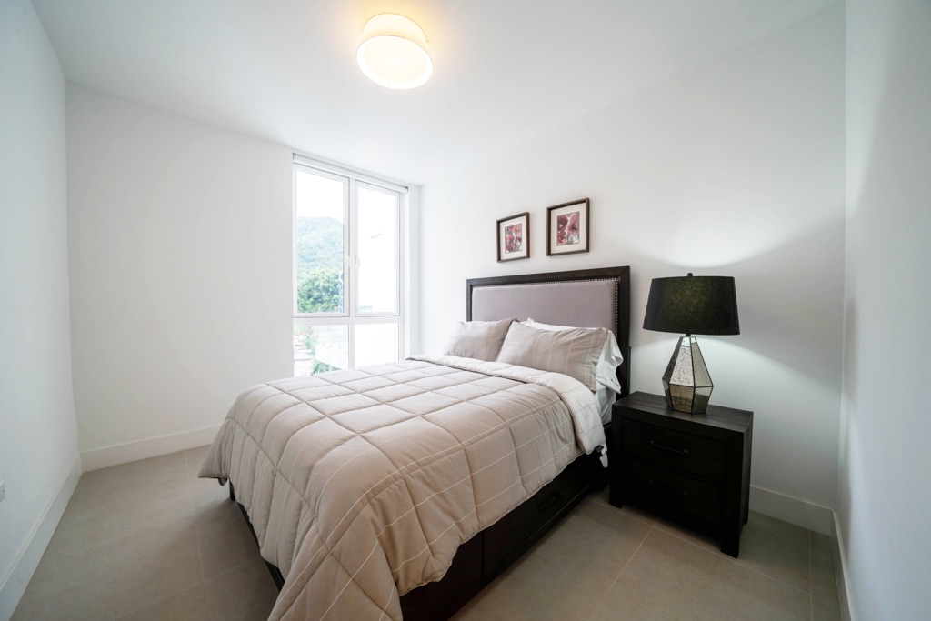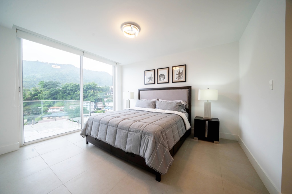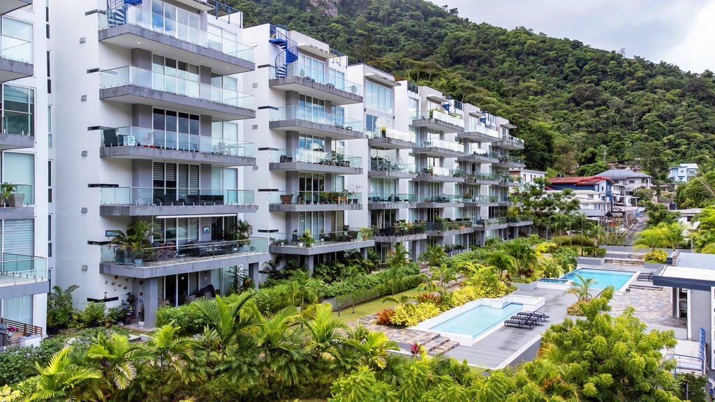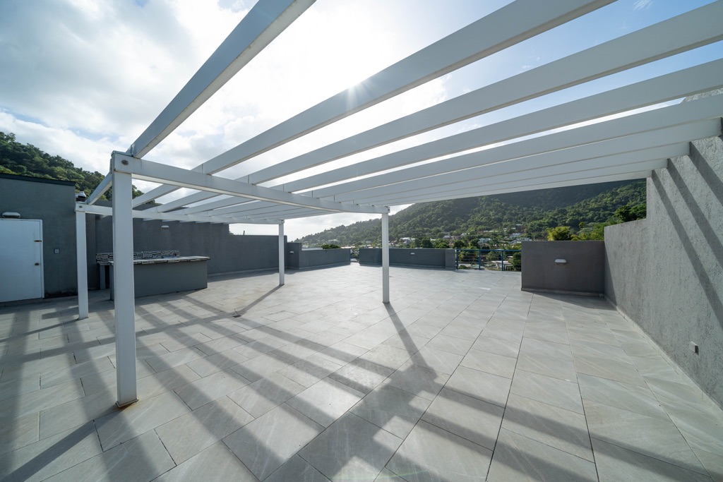This penthouse unit features a spacious rooftop with a wet bar, built-in BBQ, and high-end patio furniture for eight, ideal for entertaining while enjoying views of the Gulf of Paria and the Northern Range. It offers private access and a secondary entrance for larger gatherings. Inside, the modern, fully furnished penthouse includes 3 spacious bedrooms with shelved closets and stylish bathrooms, a separate powder room, and a kitchen with state-of-the-art appliances in an open-plan layout. The living room and main bedroom open onto balconies with comfortable patio furniture. A whole house water softening unit is conveniently located in the large storage room outside the front door. – RR55364